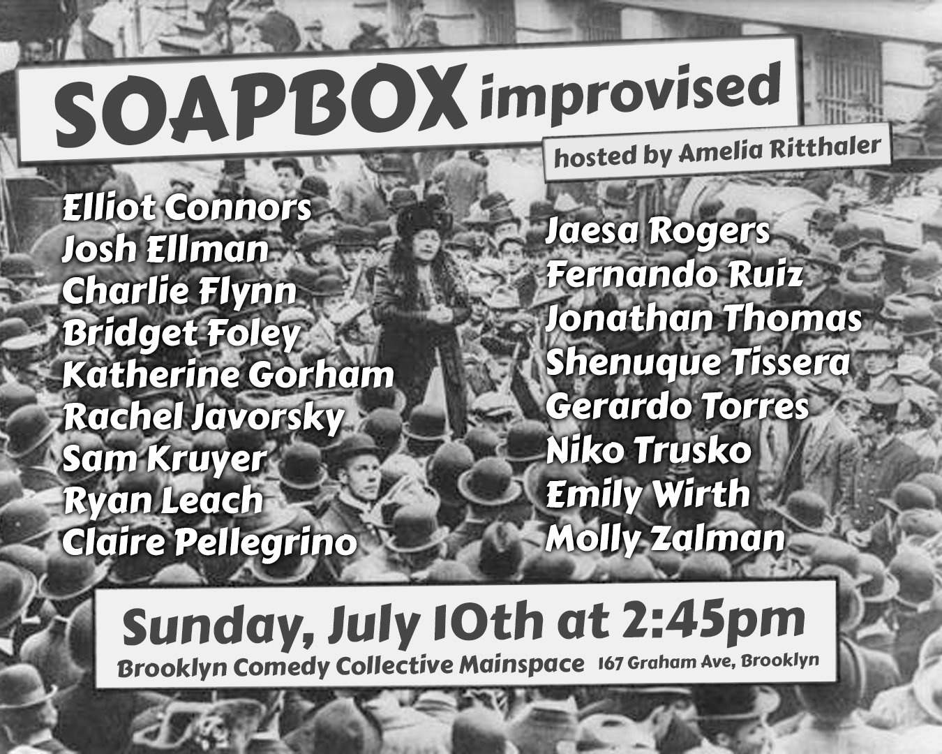 Soapbox gives comedians a platform to share their hottest takes! The catch? It’s improvised! This rapid-fire show gives 15 comedians 1-minute each to give an impassioned speech on a topic drawn from a hat just moments before their timer starts. There’s no time to prep, only time to preach!! Topics will range from culture icons to mundane household items to history's biggest philosophical quandaries.