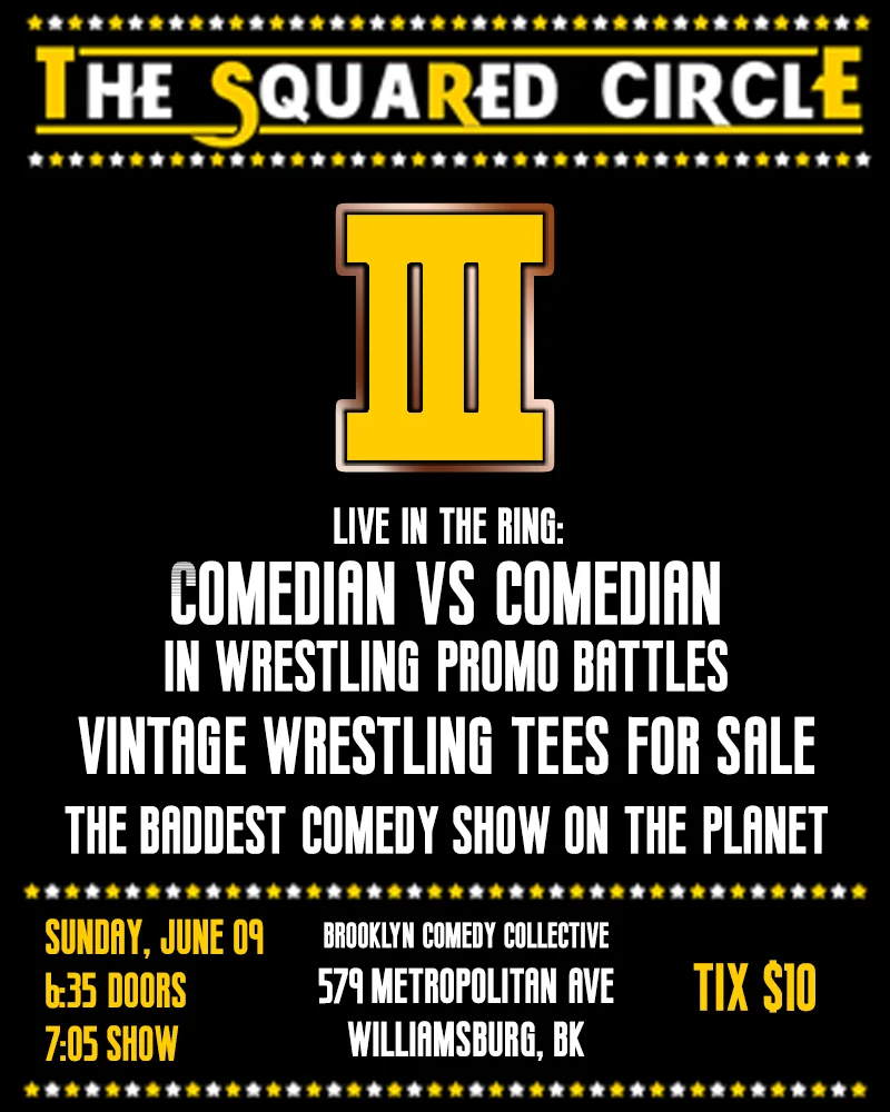 The Squared Circle fills the roast battle with the spirit of professional wrestling; performers compete with their best trash talk and self-promotion, and crowd reaction determines the winner, with the ultimate prize being the Comedyweight Championship.