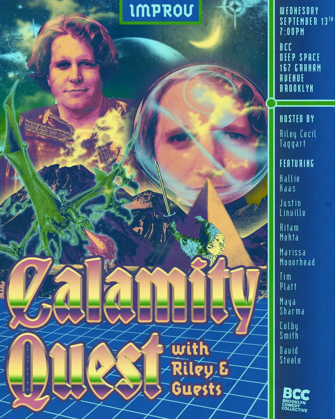 Calamity Quest is a fully improvised fantasy epic performed by a beautiful combo of Fantasy Nerds and Normal People. Each show takes you on a journey using classic fantasy genre tropes — ancient evil awakening, princes being dicks, siblings who fuck… you know, the classics.