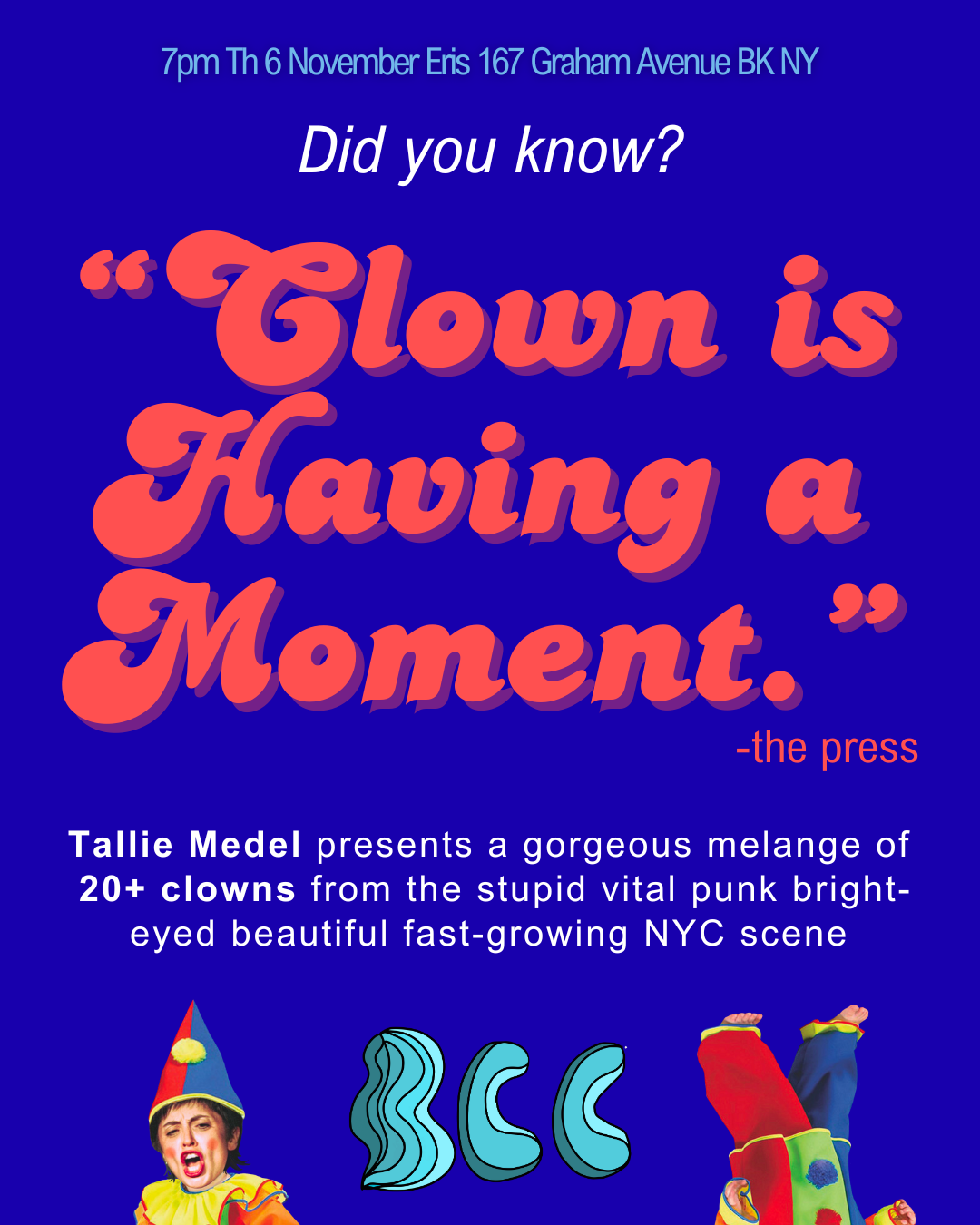 Absurd times call for an absurd response. Tallie Medel, the founder of BCC's popular clown curriculum, hosts an absurd amount of New York City's precious idiots on the Eris MainStage. Enjoy the buffet*, everything's delicious! (*the clowns)