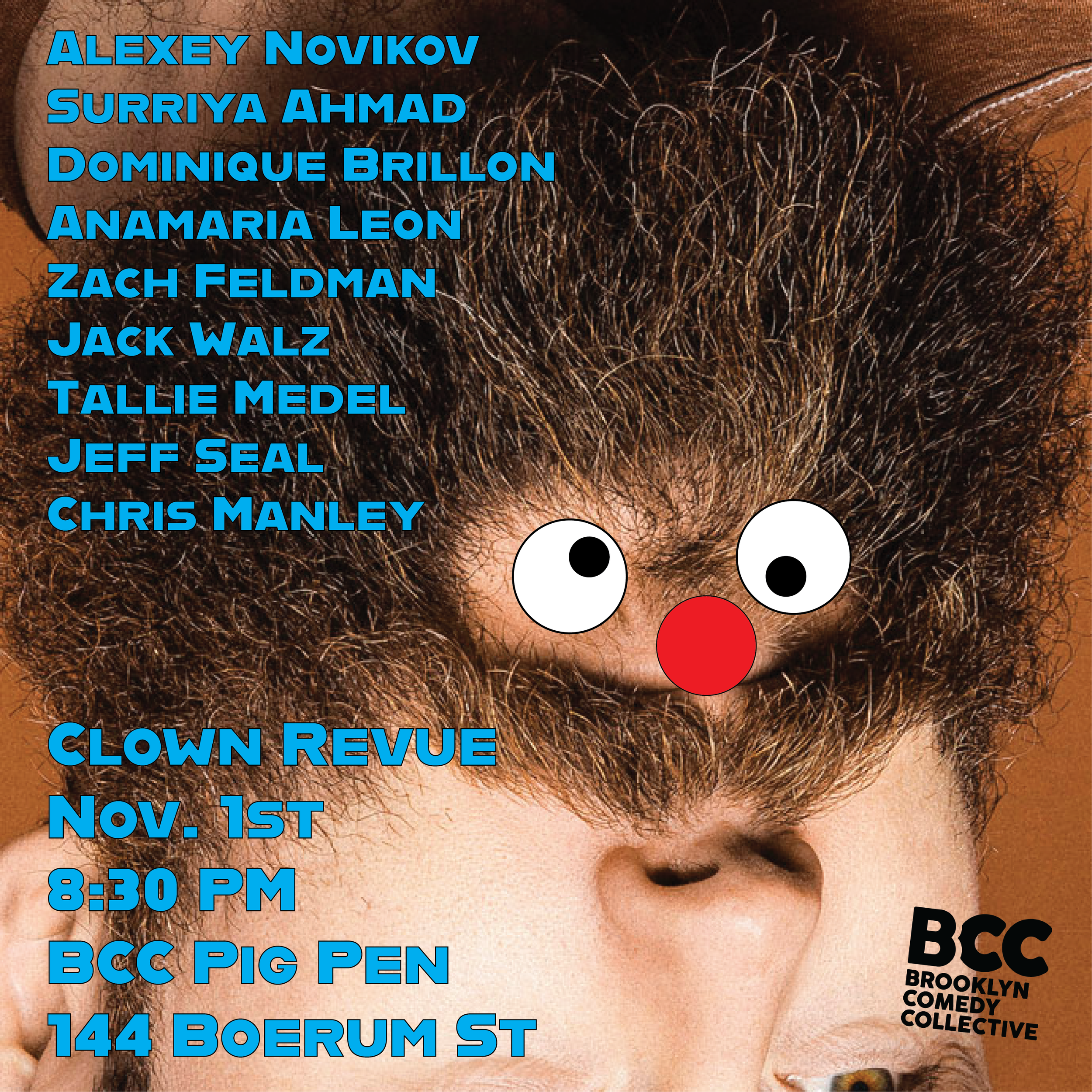 The Clown Revue is a monthly showcase featuring pieces by seasoned New York clowns (and beloved BCC clown teachers) Chris Manley, Jeff Seal and Tallie Medel alongside turns from BCC’s highly talented clown students.