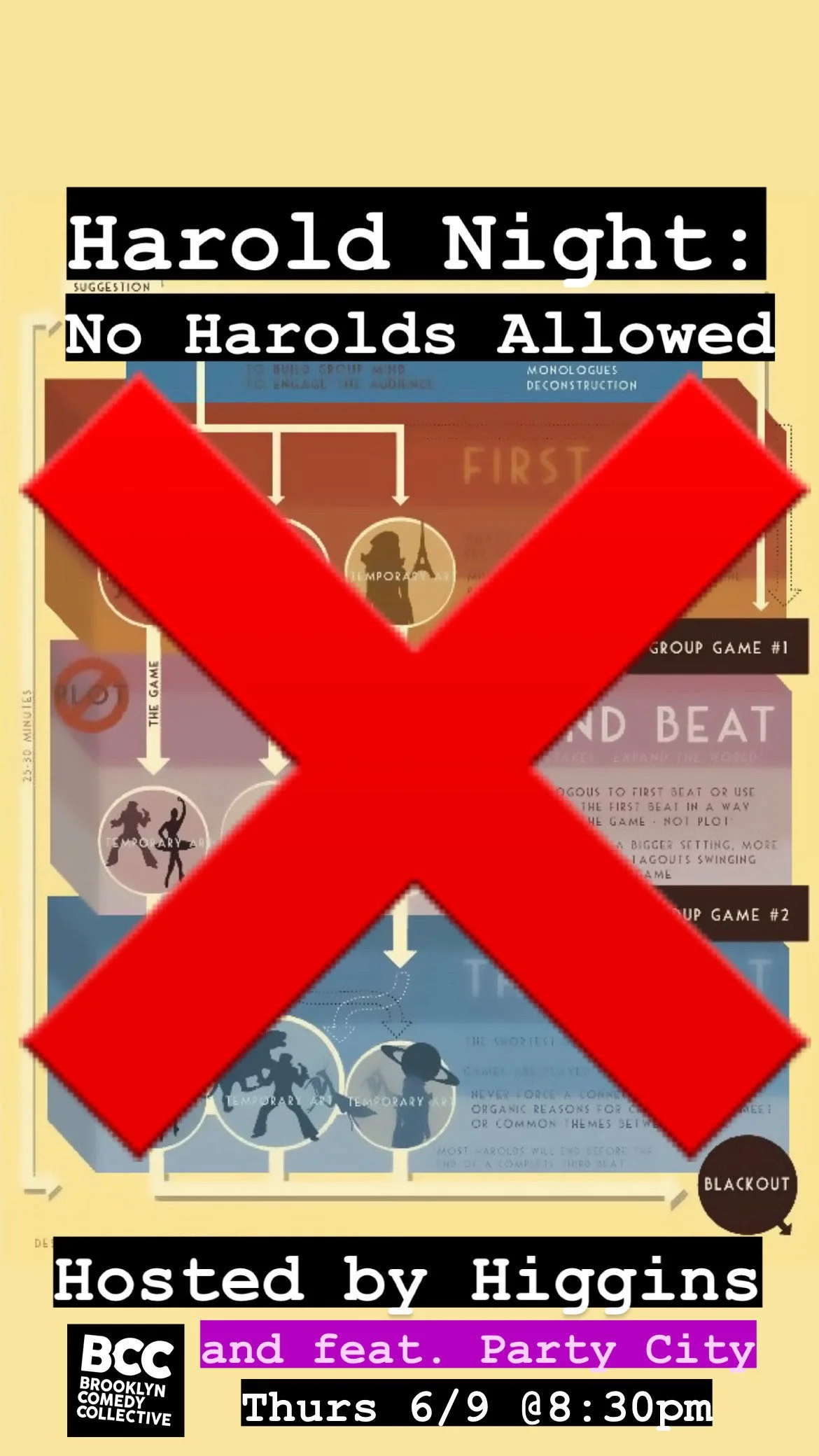 Longtime UCB Harold team Higgins host another reassembled all-star Harold team. Both groups will perform ANYTHING BUT the harold. Minds will meld, faces will melt. Featuring special guests: former UCB Harold Team Party City!