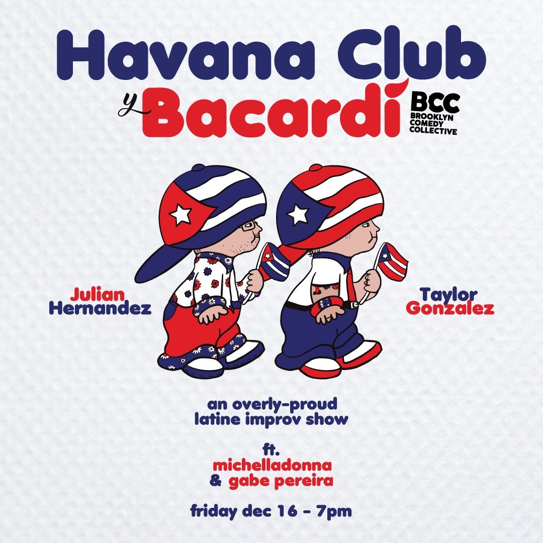 ¡Oye cabrón! You want to see some improv or some shit? Havana Club y Bacardí got you covered. 2-person improv from Julian Hernandez (Cubano) y Taylor Gonzalez (Boriqueño y Salvadoreño). Salsa music, yelling over each other, and deeply personal Latine comedy coming your way.