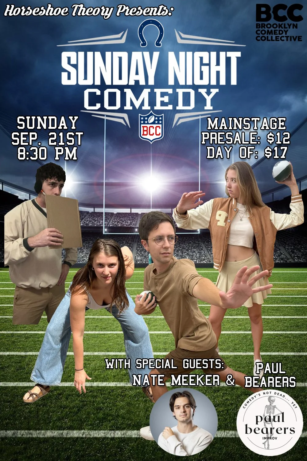 We know you've been waitin' all day for Sunday night, where two improv teams and one all-star standup will take the stage during primetime. Unlimited  laughs, big 3rd downs, and the occasional live reaction to the actual primetime Kansas City Chiefs vs New York Giants game. Horseshoe country...let's ride.
