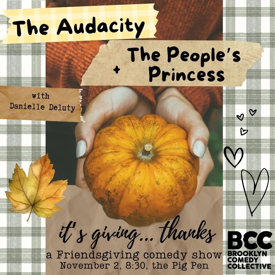 It’s time to give thanks. What are you thankful for? What are you NOT thankful for? The Audacity and The People’s Princess will perform sets inspired by your dysfunctional or functional, stories about a Friendsgiving (or Thanksgiving) canon event. The juicier the better!