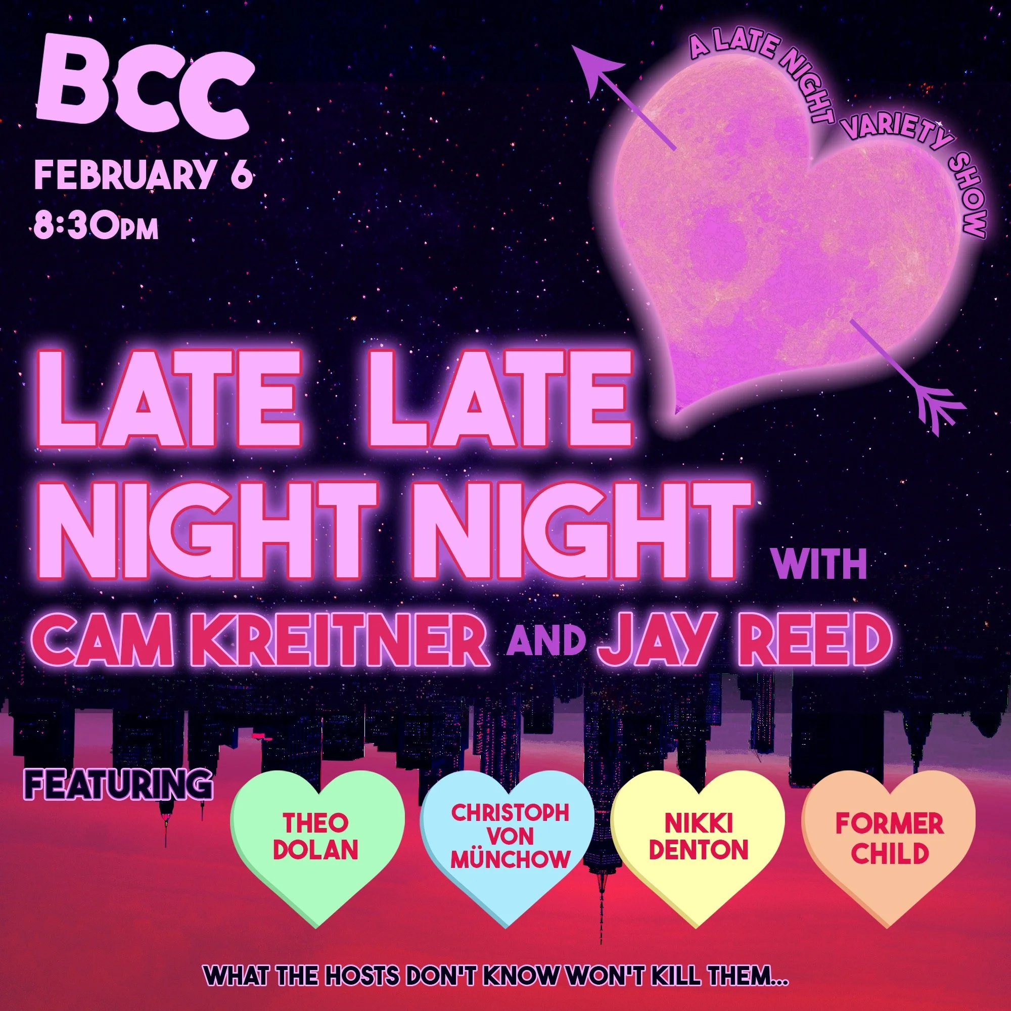 Love is in the air and so is a late night variety show! Join Cam and Jay as they find out who their guests are and what their monologue says LIVE at the BCC!!!
