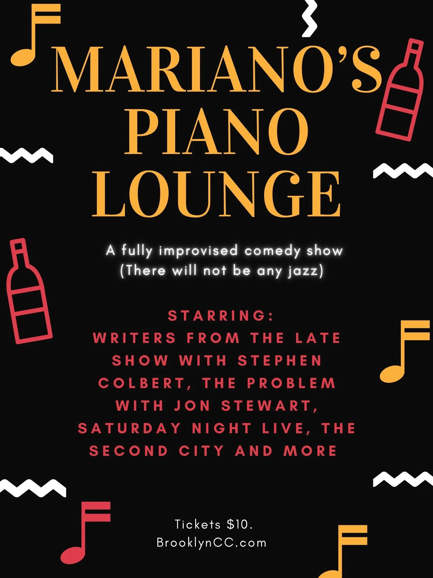 The cast's credits include The Late Show with Stephen Colbert, The Problem with Jon Stewart, Work in Progress, The Second City, and Improvised Shakespeare.