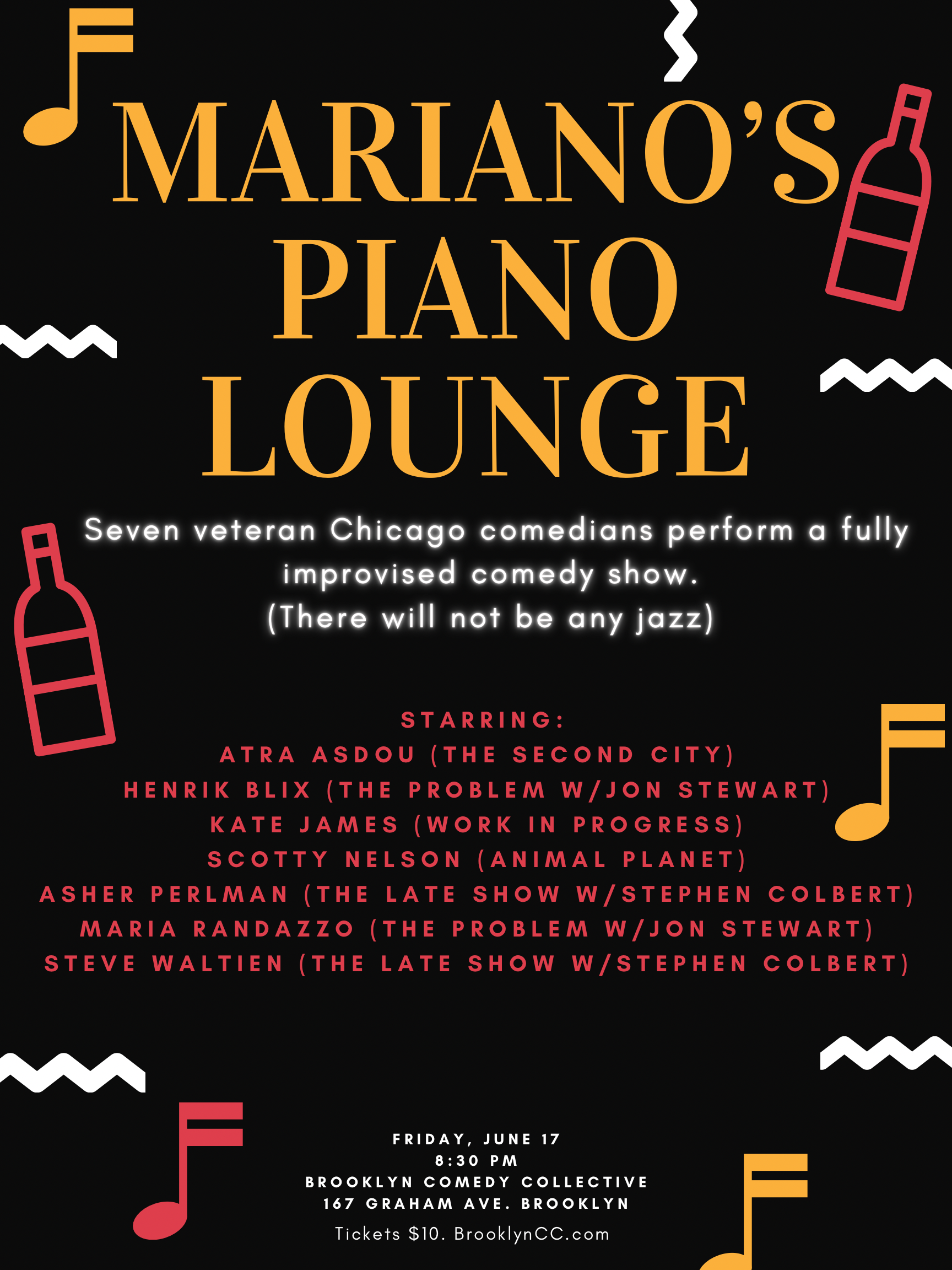 The cast's credits include The Late Show with Stephen Colbert, The Problem with Jon Stewart, Work in Progress, The Second City, and Improvised Shakespeare.