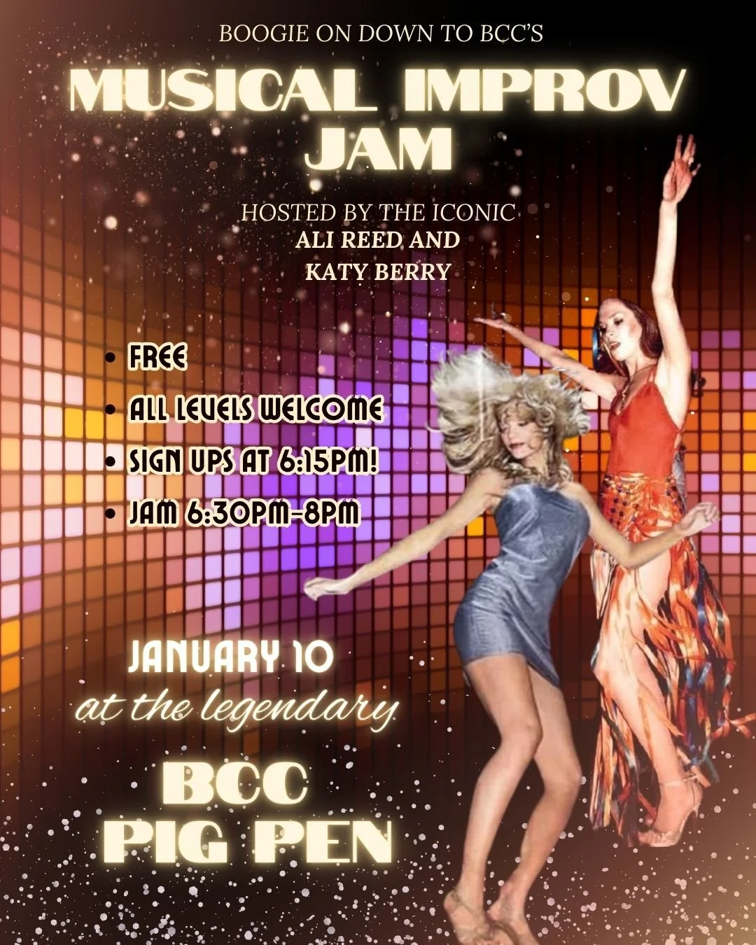 BCC's inaugural Musical Improv Jam! Sign up promptly at 6:15 pm to snag a spot and your hosts, Katy and Ali, will match you with your perfect partners to perform scenes-into songs with a special prompt. Come excited to tackle openings, trios, and tag-lines, oh my!