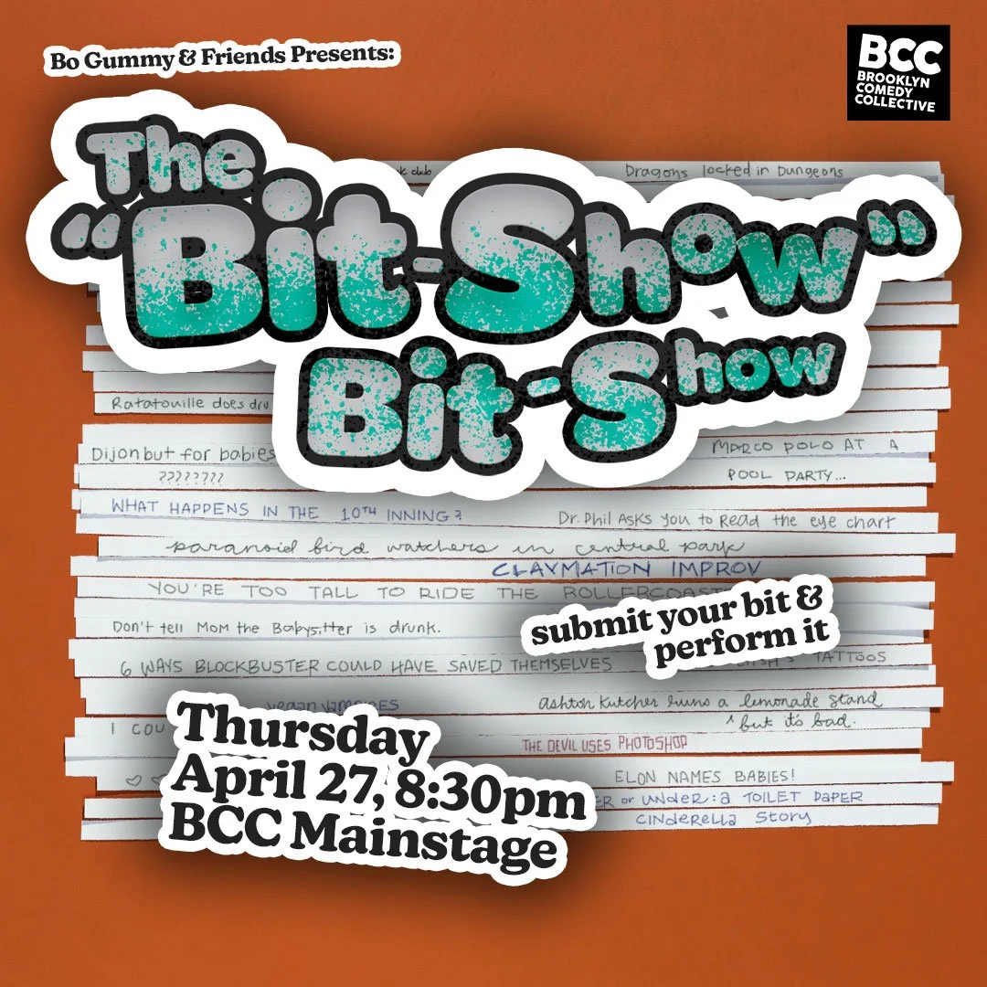 Jennifer Coolidge's Book Club. Claymation Improv. Elon names babies. This is a show of only bits (we're talking 25-30) performed by audience members and your hosts Bo Gummy (See? We're already doing a bit!). Anyone can submit their bit ideas to perform with their friends (submission link @godummycomedy) or wait and receive one from the world's tiniest hat on stage during Bo Gummy & Friends Presents: The Bit Show Bit Show. Only one will become the Ultimate bit... or is that another bit...