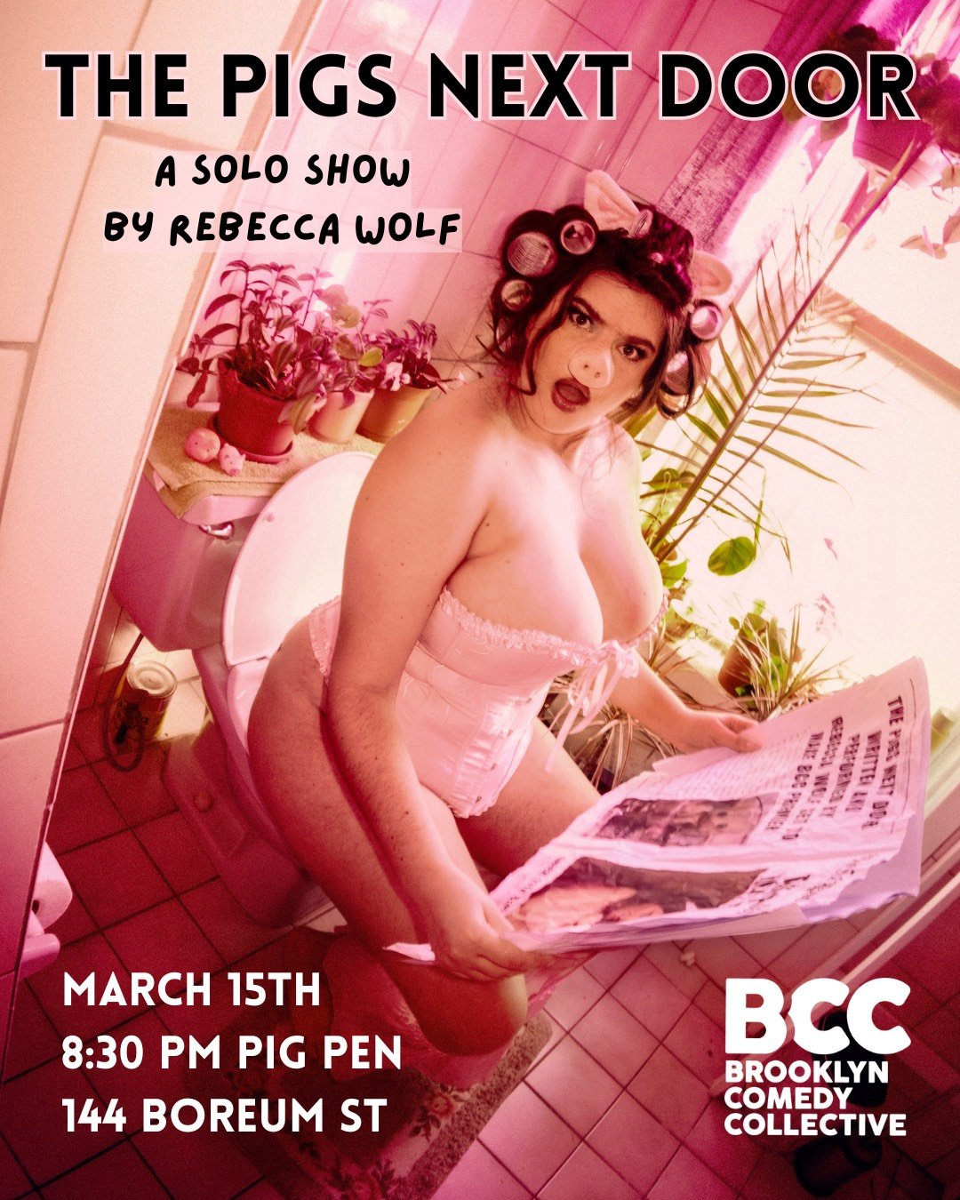 The Pigs Next Door is a silly, sexy, and surprising solo show that blends various comedy styles and audience participation. Inspired by sitcoms like "The Nanny," The Pigs Next Door follows a pig housewife, Peg, and her marital troubles with her husband, Joel, who happens to be a stuffed animal. Unlike traditional solo shows, this show builds a world with the audience and incorporates them into the performance. Throughout the show, audience members become characters and improvise scenes with Peg to work through her and Joel's issues, revealing the nature of their complicated relationship and the unusual neighborhood they inhabit.