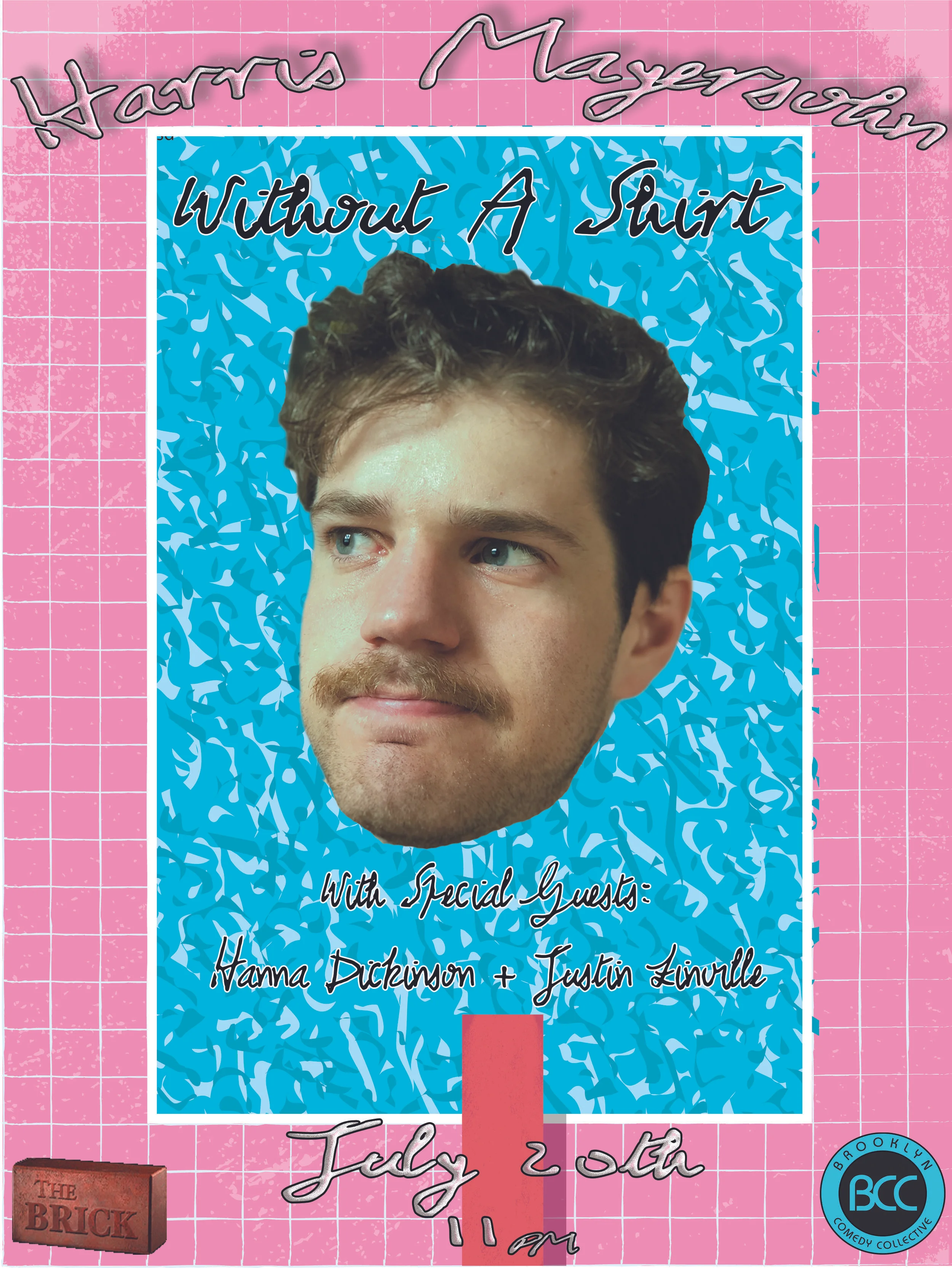 HARRIS MAYERSOHN: WITHOUT A SHIRT is an hour-long, comedic, multimedia deep dive into Harris Mayersohn’s (Late Show w/ Stephen Colbert, New Yorker) psyche. Without A Shirt is an absurd journey through Harris’ unstoried comedy career featuring stand-up, videos, massage tutorials and, of course, some of Harris' world-renowned vape trick routines (+ much more!) It’ll be a delightful evening with specials guests Justin Linville (The Chris Gethard Show) & Hanna Dickinson (Comedy Central’s Creators Program).