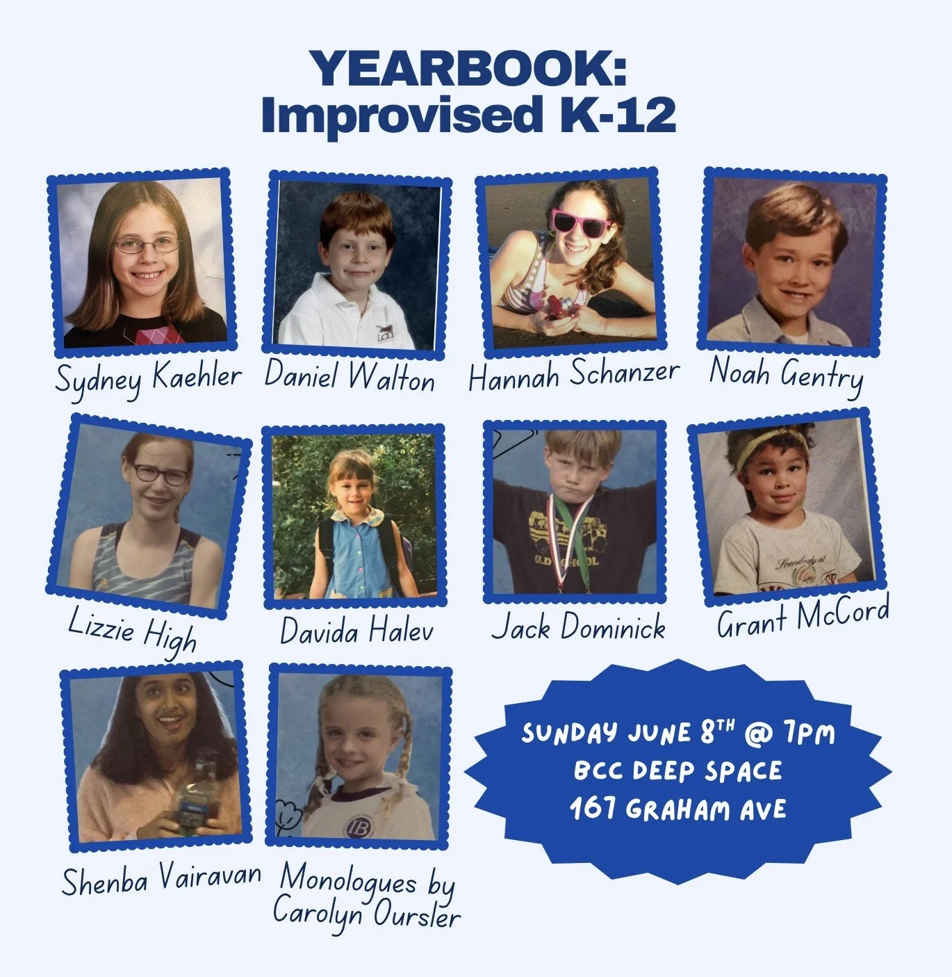 School is hard. Growing up is harder. Yearbook: Improvised K-12 sees 9 comedians improv their way through elementary, middle, and high school. Students, teachers, principals, and PTO parents will navigate the challenges of growing up. They’ll learn hard lessons, have their first crushes, and they might not all make it to college. Inspired by audience suggestions and the ramblings of a guest monologist, Yearbook will warm your heart and tickle your funny bone. See you in class!!